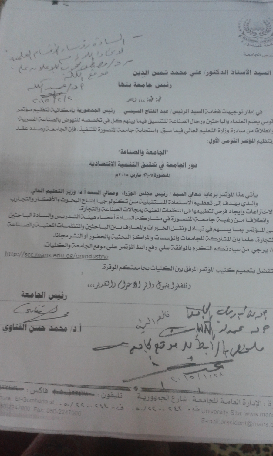 تعقد جامعة المنصورة المؤتمر القومي الأول - الجامعة والصناعة " دور الجامعة في تحقيق التنمية الإقتصادية " يأتي هذا المؤتمر برعاية برعاية معالي السيد/ رئيس مجلس الوزراء ومعالي السيد أ.د/ وزير التعليم العالي ، لذا يرجي رفع رابط المؤتمر