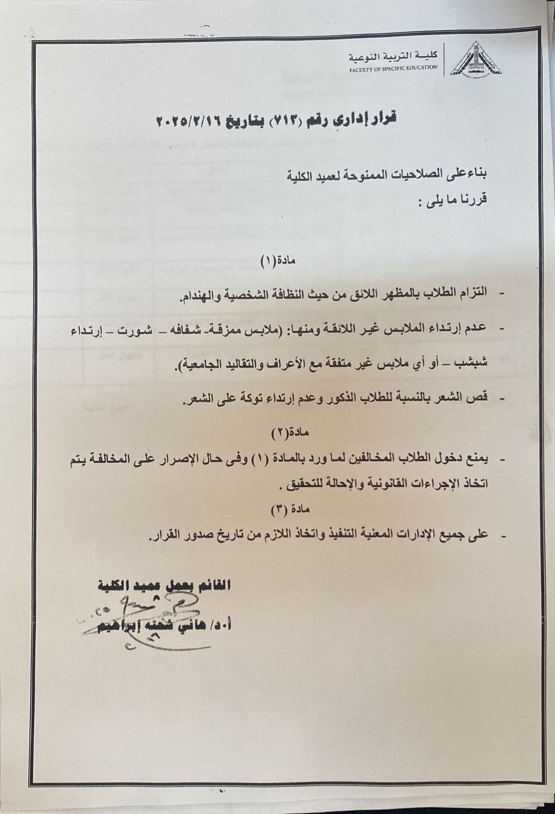 - الالتزام بالزي اللائق الذي يتناسب مع القيم والتقاليد الجامعية.