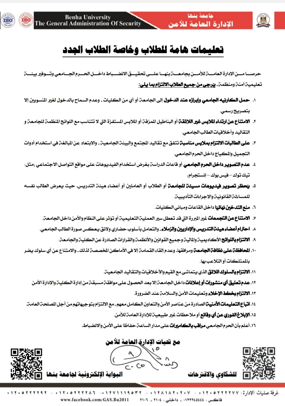 - الالتزام بتعليمات الأمن والسلامة والتعاون مع أفراد الأمن داخل الجامعة.
