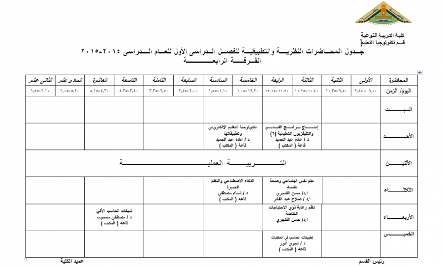 جـــدول المحـــاضرات النظريــــة للفصـــل الــدراسى الأول للعـــام الــــدراسى 2014-2015 بقسم تكنولوجيا التعليم