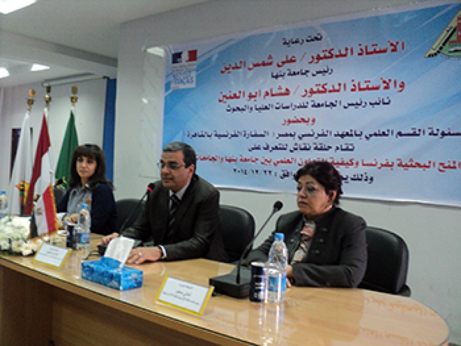 حرصا من جامعة بنها على زيادة توفير فرص للبحث العلمي لأعضاء هيئة التدريس خارج مصر وكذلك توفير فرص تبادل علمي بين الجامعات المصرية والجامعات الفرنسية تم تنظيم ندوة بالتعاون مع المعهد الفرنسي بمصر بحضور الأستاذ الدكتور/ هشام أبو العنين - نائب رئيس الجامعة لشئون الدراسات العليا والبحوث والأستاذة الدكتورة/ أماني سمير - رئيس قسم اللغة الفرنسية بكلية الآداب والأستاذ الدكتور/ عادل تكلا - وكيل كلية الآداب السابق للدراسات العليا والعضو الدائم للجنة العليا للترقيات والأستاذة/ ندين مكاوي - مسئولة القسم العلمي بالمعهد الفرنسي بمصر وعدد كبير من أساتذة اللغة الفرنسية بالجامعة.