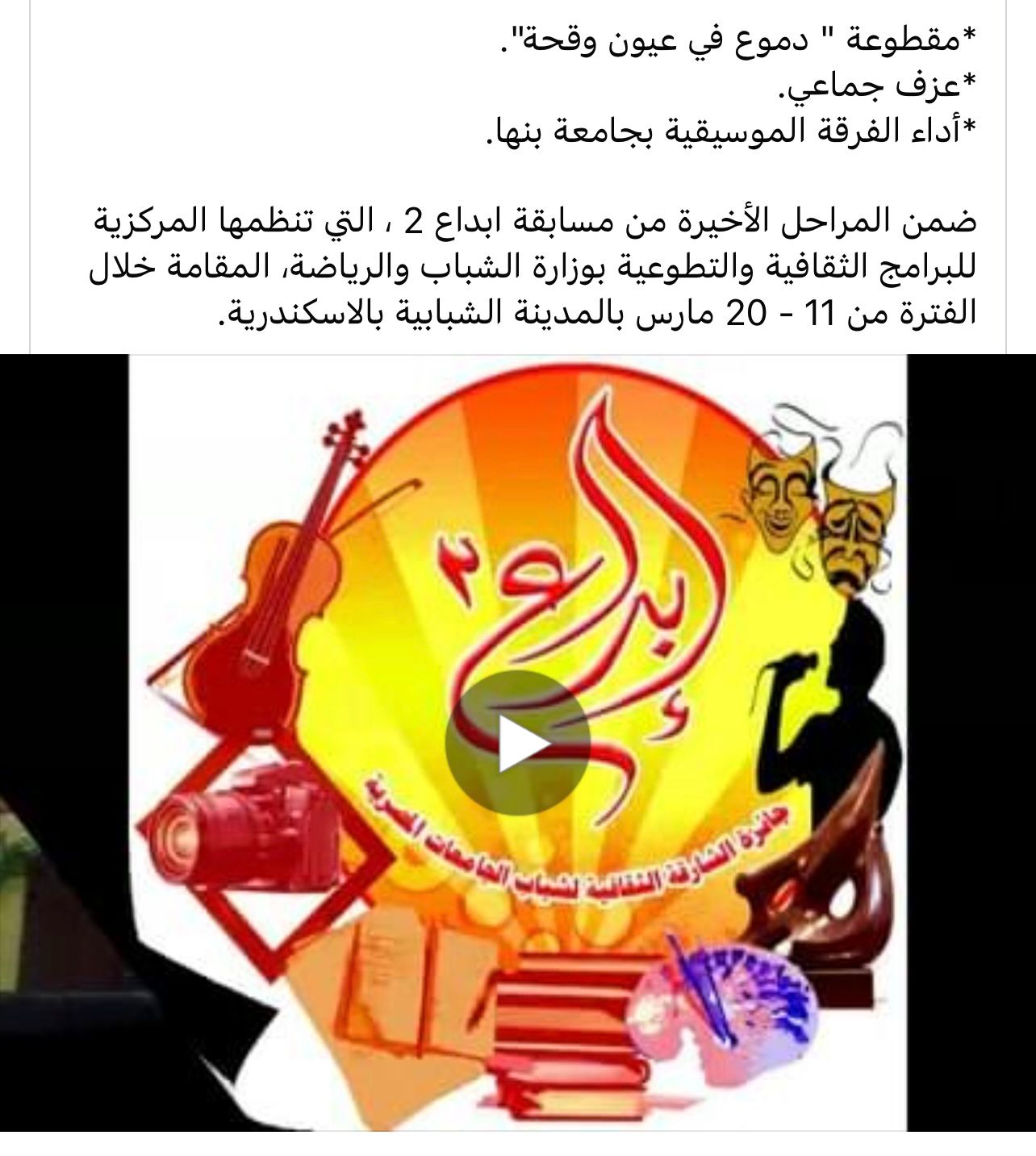 مشاركه فعاله مميزه لطلاب وطالبات كليه التربيه النوعيه جامعه بنها ببرنامج اعداد معلم التربيه الموسيقيه ضمن فعاليات مسابقه ابداع بوزاره الشباب والرياضه
